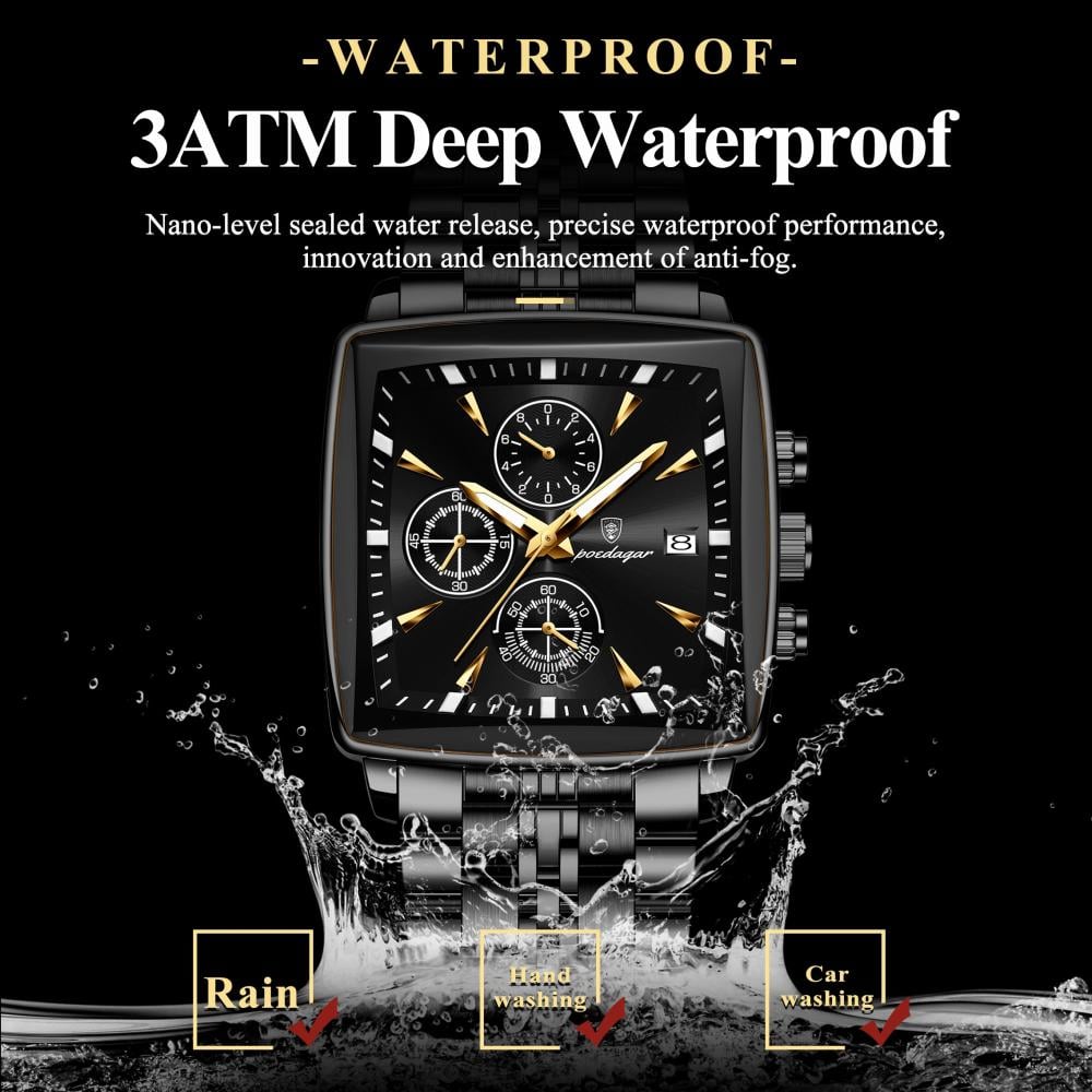 ساعة يد مربعة رجالية أنيقة، بتصميم عصري وميزات متطورة. مقاومة للماء، مزودة بوظائف كرونوغراف وعمر طويل، ما يجعلها الخيار المثالي للرجال الأنيقين.